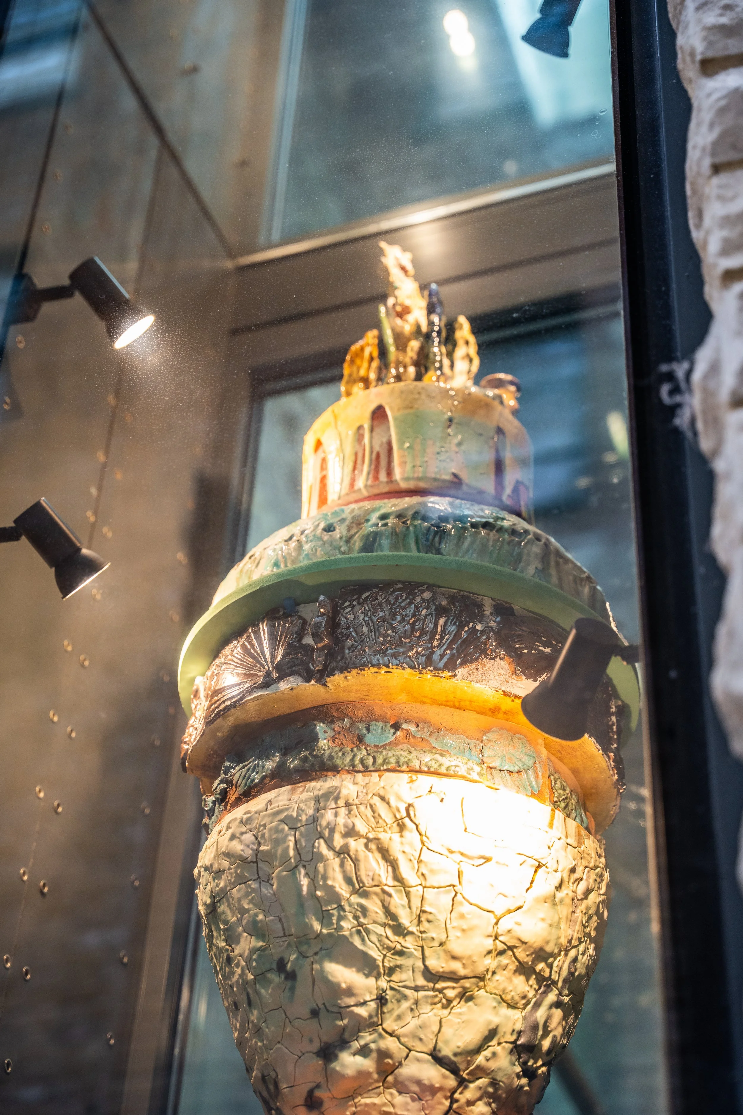 “The Liberty Vessel” references both ship and container, questioning freedom as something transported, negotiated, or traded. Composed of distinct, hand-built ceramic sections, each with unique textures, glazes, and embedded fragments, the sculpture mirrors the diversity of goods and human experiences that once flowed through this riverside artery. Its layered form evokes the industrial vitality and environmental strain of a city that prospered through exchange while polluting its own lifeline.
